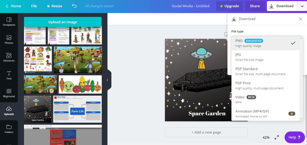On the left, you’ll see a column with a variety of options. Choose Uploads. Click on  the Upload an Image blue bar at the top. Choose the image to upload from your computer.