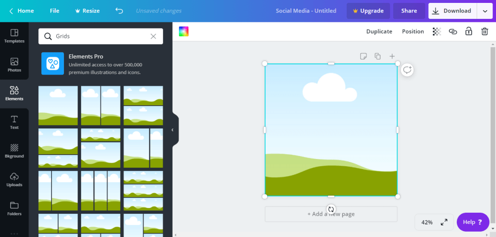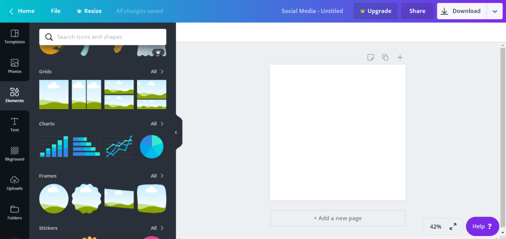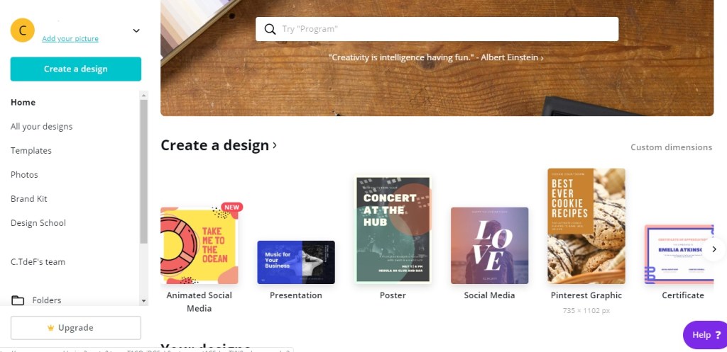 To do this, go to Canva and sign up for an account. It’s free. I use the social media 800 x 800 px template, but you could choose another size. There are even full page options. Once you choose the size you wish to work with, click on it and a new tab will open.