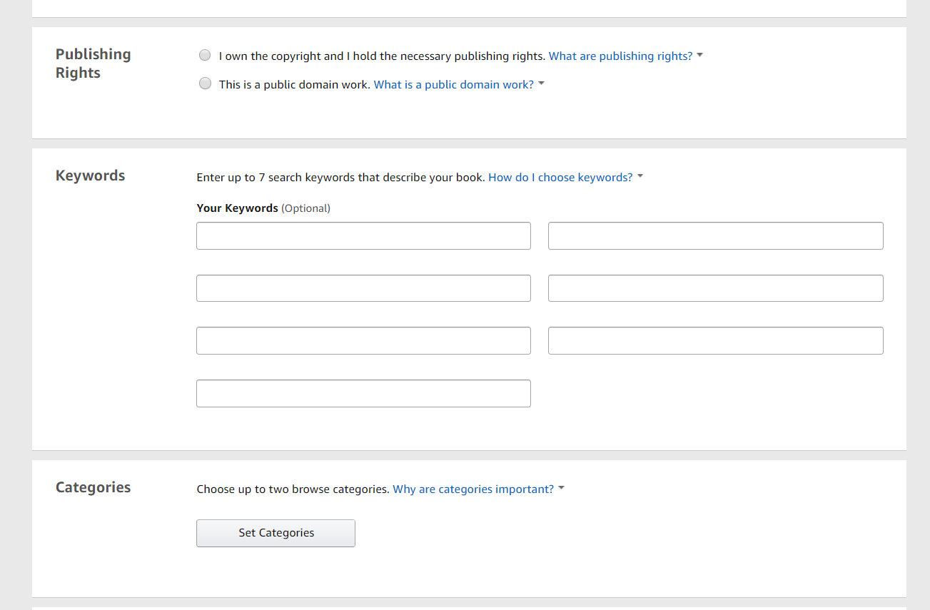 The next category is Publishing Rights. As this is a Blog to Book Project, you will choose “ I own the copyright and I hold the necessary publishing rights.” Unless you take your blog posts down before uploading your manuscript, you may get a notification from Amazon saying that the content of your book is already freely available on the web. That’s perfectly fine. You just have to resubmit the manuscript verifying that you are the author of those freely available posts.