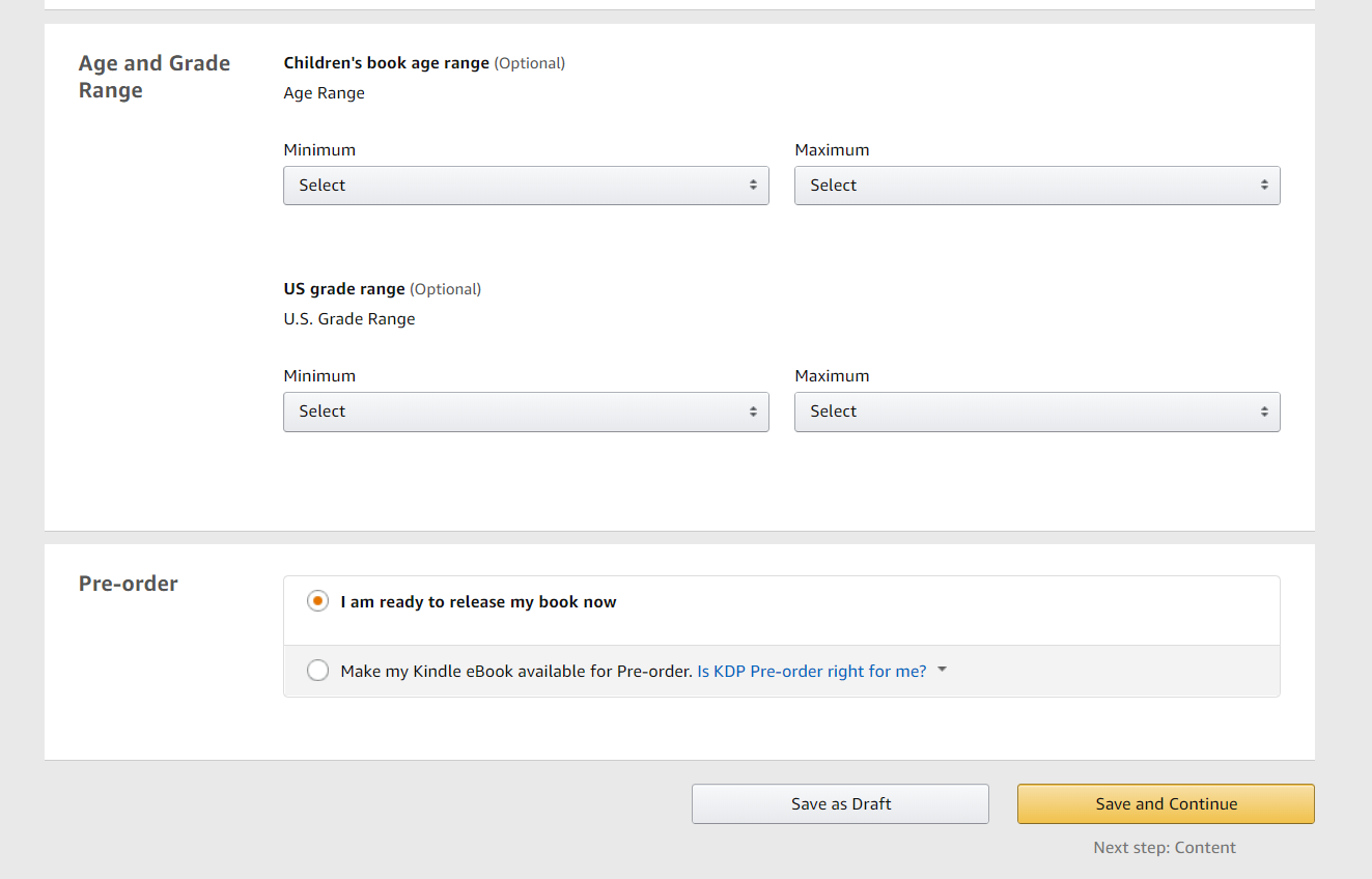 The last section on this page is to choose whether your book is ready for publishing or if you would like to generate some pre-order publicity hype first. It’s entirely up to you. Then choose Save and Continue to move along to the next step.