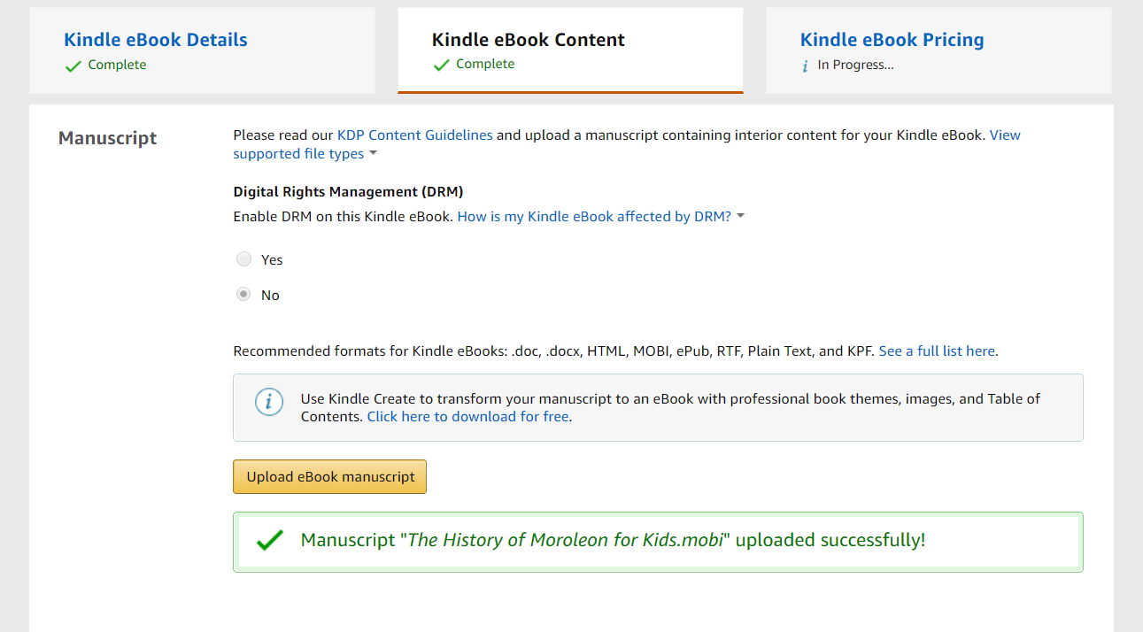If you are sure you’ve done all the formatting correctly and have your ebook saved in one of these formats (.doc, .docx, HTML, MOBI, ePub, RTF, Plain Text, and KPF.) you can upload your ebook now. You can also download Kindle Create to format your book correctly. Doing so might save you some time and frustration in the long run because you just can’t publish until the formatting it right.