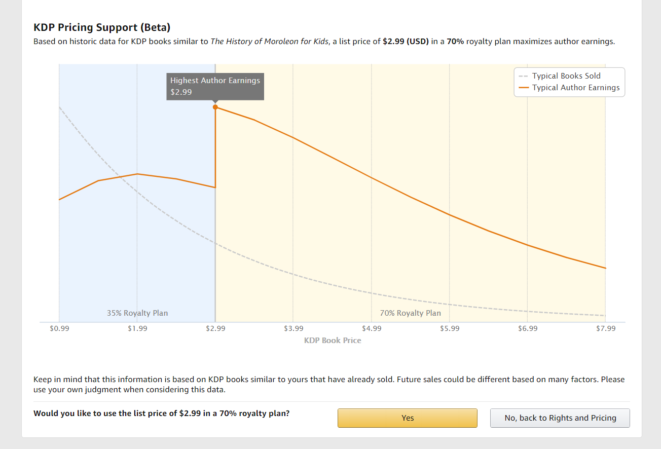 KDP Pricing Support (Beta) will give you an idea of what to charge for your ebook based on the prices of books similar to yours. You can use the figure Amazon provides (they generally know what they are talking about) or you can choose another price.