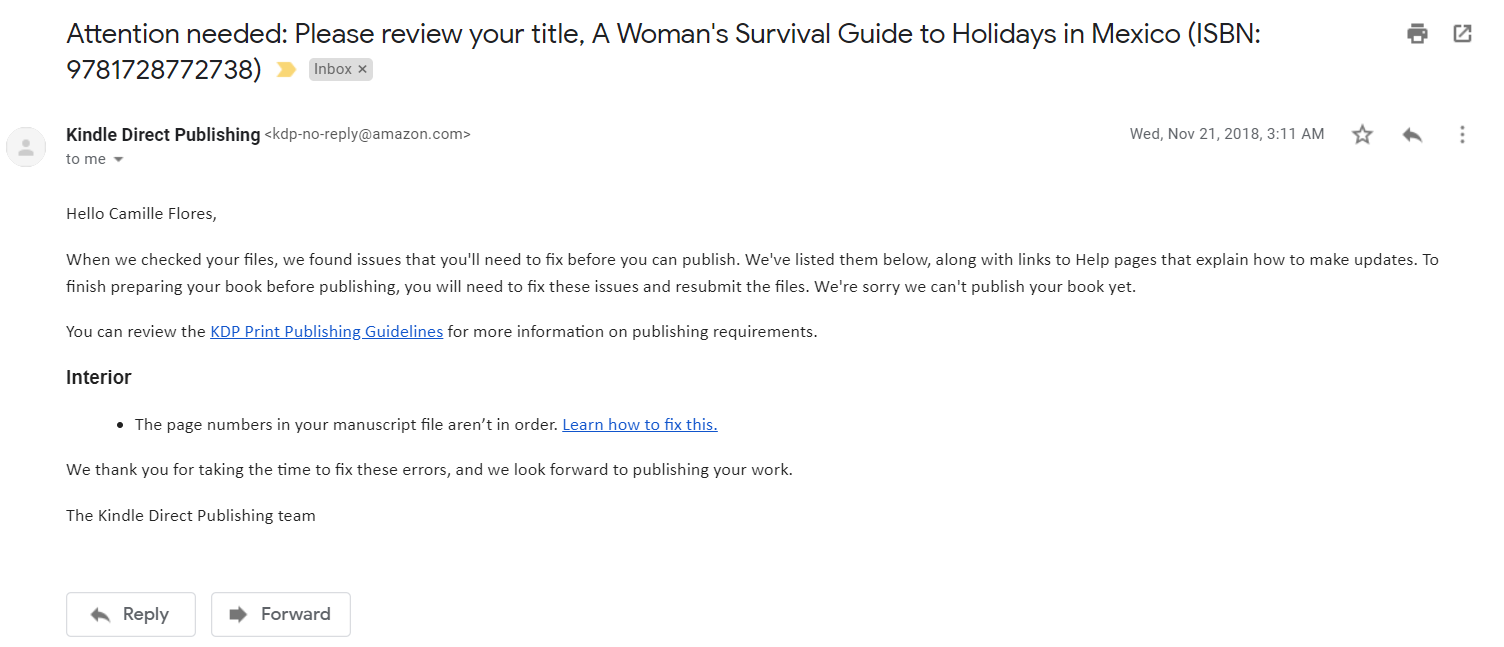 You’ll receive a notification that your book is undergoing review and another email if there is something that needs to be fixed or that the book is available for purchase. You did it!
