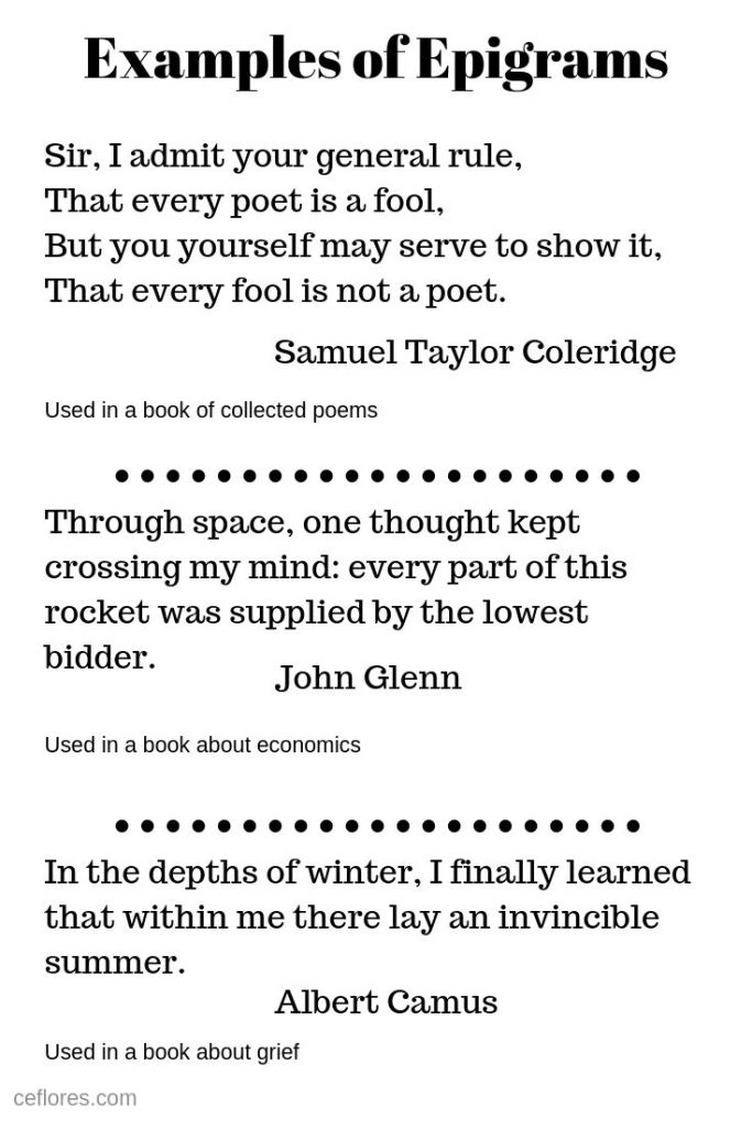 Sometimes, in place of a dedication, an author will include an epigram. An epigram is a pithy statement that either has something to do with the inspiration behind the book or the content of the book. Many times they are written in rhyming verse.