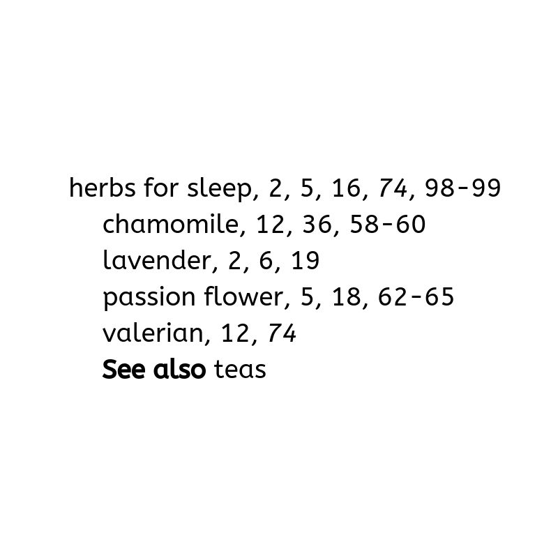 When you want to cross-reference an entry with another use See also and list the alternate entry. Therefore after the entry chamomile, you might have See also herbs for sleep which lets the reader know that additional information about chamomile can be found under the entry herbs for sleep.