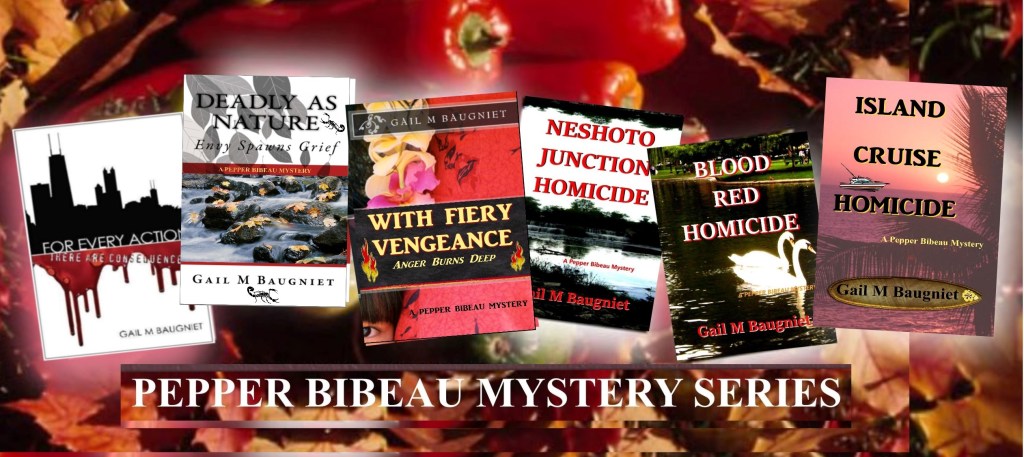 Insurance Investigator Pepper Bibeau’s field work shouldn’t include her involvement in homicide cases. But whether her assignment takes her to Chicago in For Every Action; to Boston in Blood Red Homicide; to Honolulu for With Fiery Vengeance and Island Cruise Homicide; or keeps her in Wisconsin for Deadly as Nature; and Neshoto Junction Homicide, she is either finding a dead body or finding herself implicated in the investigation of a dead body. Either way, these cozy novels offer entertaining reading for soft-boiled mystery lovers.