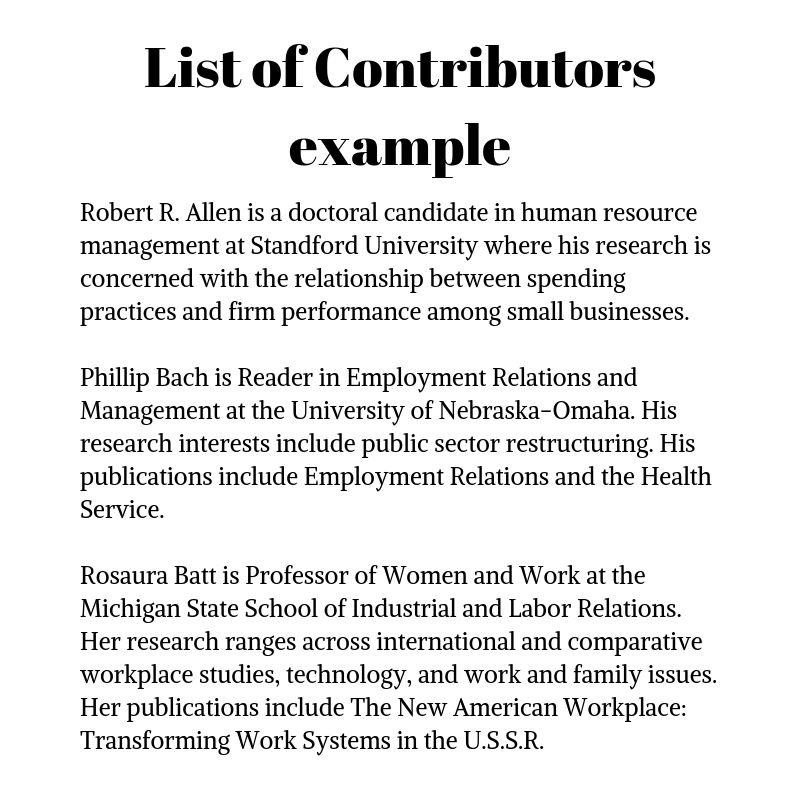 You might include editors, translators, publishers, agents, professional proofreaders, or professors in this section. Librarians and research assistants deserve their due as well. Don’t feel as if you have to include every publication each contributor wrote in this list. Instead, include the one or two most relevant to your book topic.