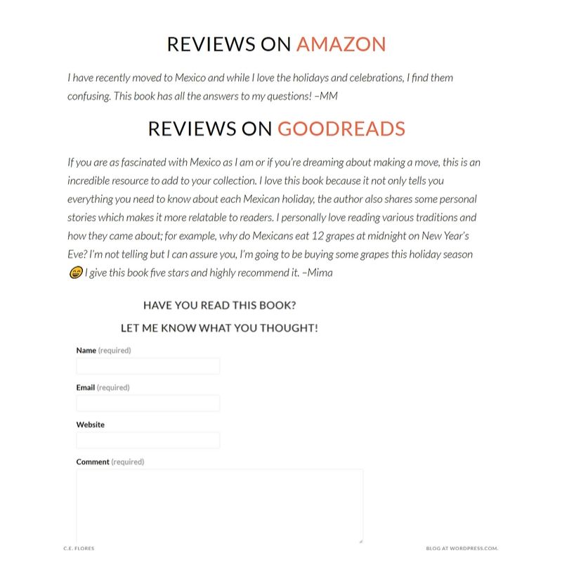 You book’s landing page on your author’s website or blog is yet another place to ask for reviews. The landing page should have the book blurb and the front cover image. On my book’s landing page, I have included a review from Amazon and one from Goodreads under the book blurb with links to Amazon and Goodreads. I also have a contact form right there, so if someone wants to say something about my book, they can.