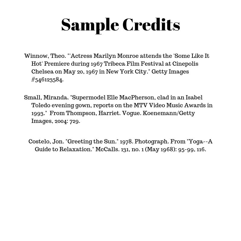 If you needed to get permission to include song lyrics, poems, images, quotations or even entire chapters, this is the section where an author gives credit where credit is due. Format the permission list in either MLA or APA style with the addition of what image or information is being referenced. Credits can be listed in alphabetical order or in order of appearance.