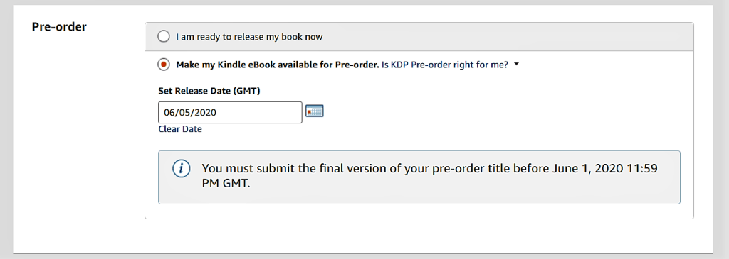 To create a pre-order, set it up as you would any other KDP ebook. When you get to the pre-order section, choose “Make my Kindle eBook available for Pre-order.” and choose a release date. You’ll get a message telling you that you need to upload the final draft a few days before that release date. Save and continue.