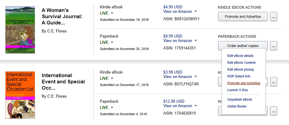 To begin, go to your KDP bookshelf and select a book you want to run a campaign for. Choose Promote and Advertise under the ellipses.