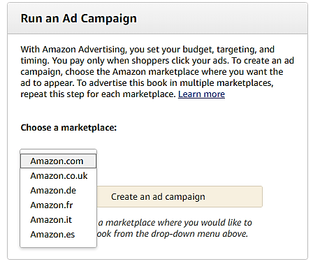 Then you’ll want to look at the Run an Ad Campaign section. Choose a marketplace from the available options.