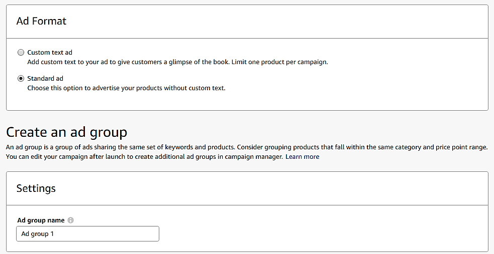 If you select the standard ad format you can create an ad group. This allows you to advertise similar books under the same bid parameters and keywords you’ve already chosen.