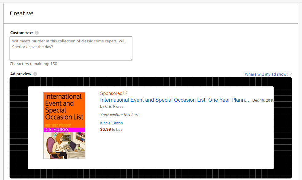 You can either use a standard ad format or a customized one. Custom text is only available on Amazon.com right now. However, if you are using that marketplace to run your ad campaign, you should use the opportunity to hook readers with creative commentary.