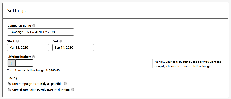 To figure out what your lifetime budget is, multiply the number of days you want the ad to run by your daily budget. The minimum lifetime budget is $100, so you’ll have to plan to spend at least that much for each ad campaign. Remember, if no one clicks on your ad, you aren’t charged with this sort of campaign, so that $100 could stretch out quite a while.